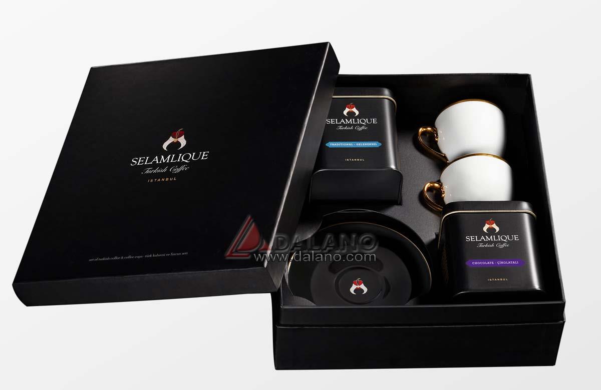 جعبه سرویس شامل: دو بسته قهوه کم کافئین با جعبه فلزی با طعم های سنتی و شکلاتی، دو فنجان و نعلبکی